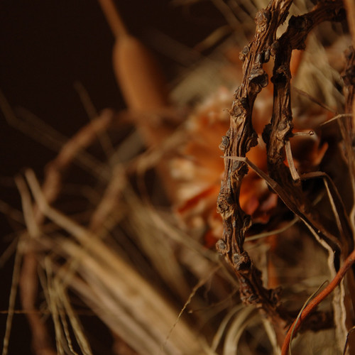 Kompozycja z suszu w naczyniu oklejonym korą bananowca. Wewnątrz suszone kwiaty, trawy, gałęzie.. Stonowana dekoracja, może stanowić wyraz pamięci o bliskich nam zmarłych.