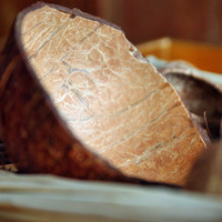 Nowoczesna kompozycja w złotym naczyniu wykonana z kory papai, bielonej wikliny, łupin orzecha kokosowego oraz bell cup.