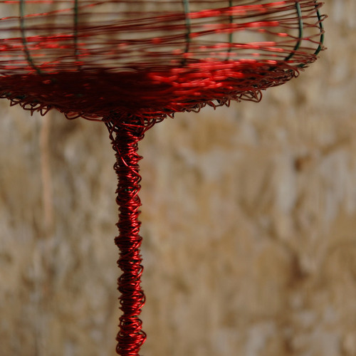 Świecznik wykonany z dwóch rodzajów drutu w kolorze czerwieni i zieleni.